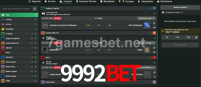 O 9992Bet oferece uma grande seleção de opções de apostas em e-sports com probabilidades competitivas
